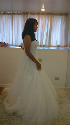 Next was a lace mermaid gown. As soon as I put it on, I knew right away that the mermaid cut wasn't for me. Since the skirt flared near my knees, it cut down my height, making me look shorter again. I also didn't like the straight neckline. Sweetheart necklines look way better on me,